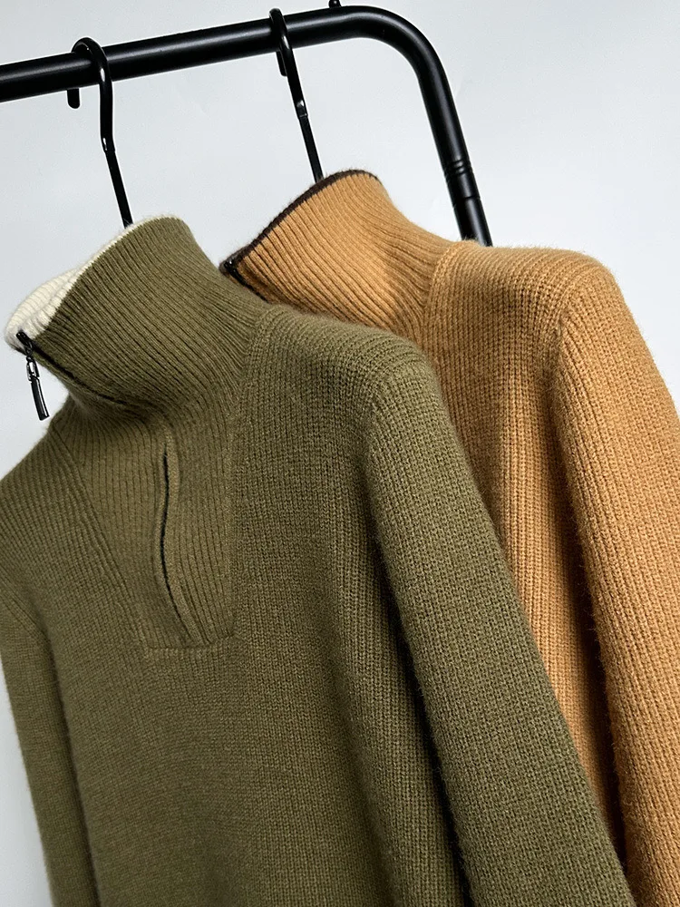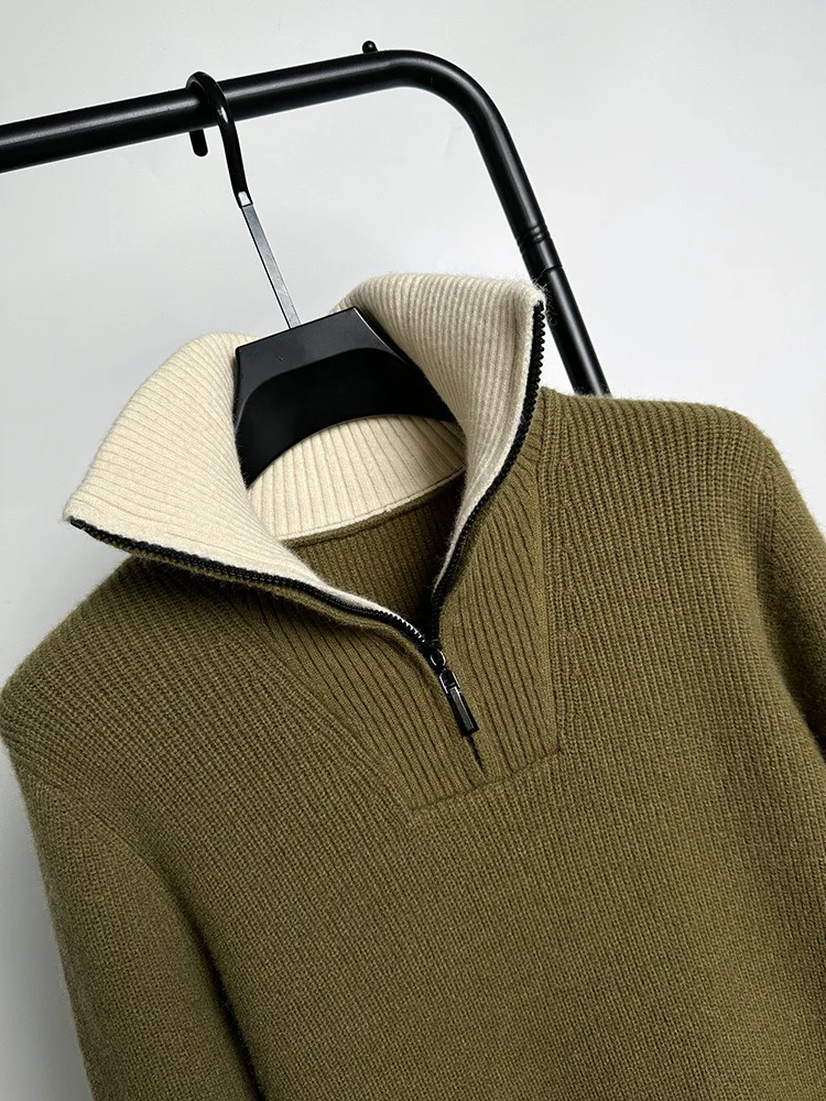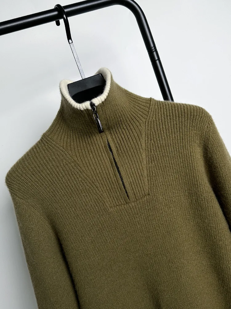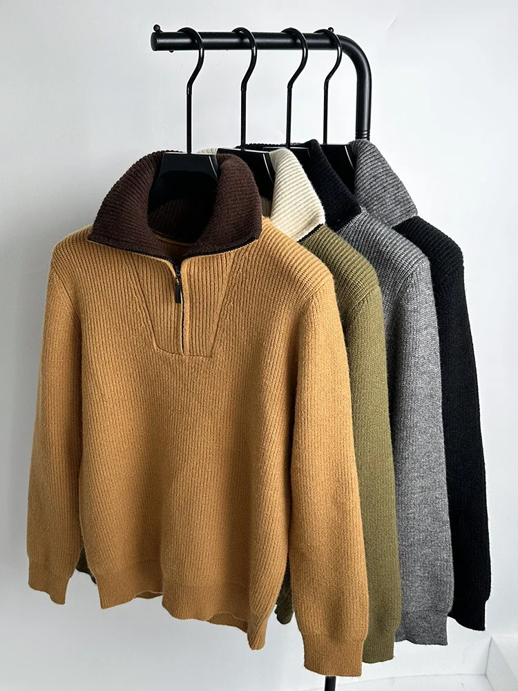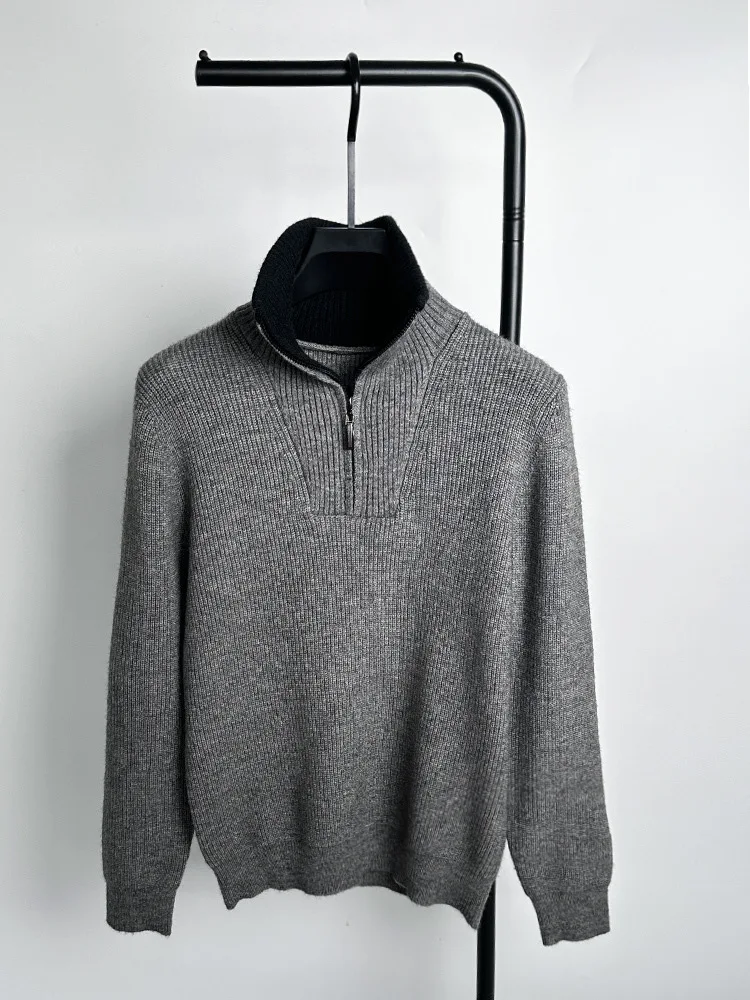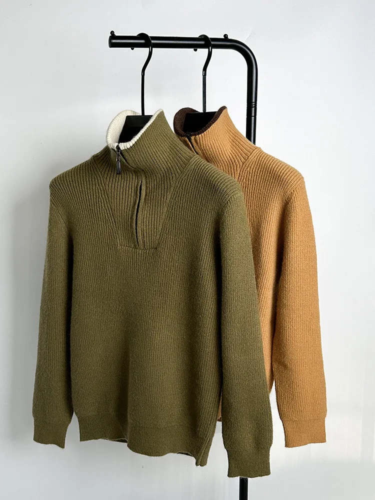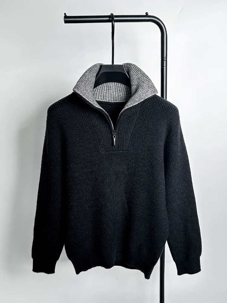 Autumn and Winter Men's Half High Neck Zipper Knitted Sweater Korean Version FashionCasualSolidColor Pullover Thickened and Warm